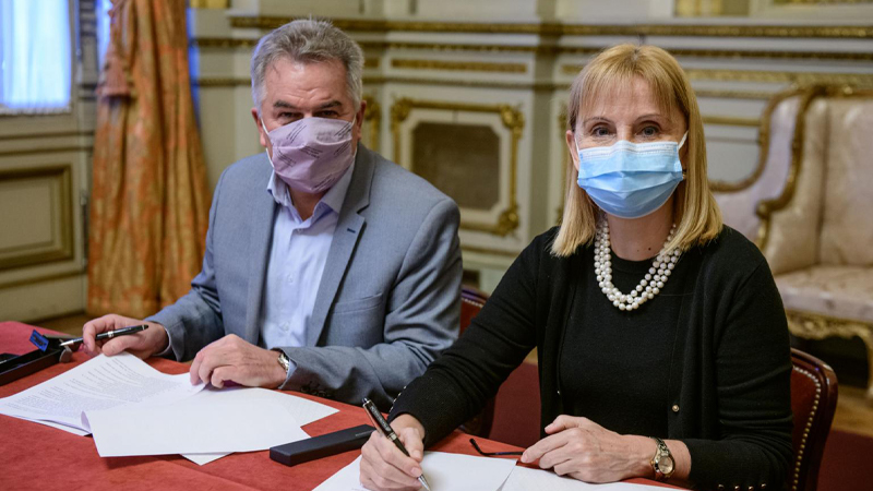 阿根廷科隆剧院院长玛丽亚·维多利亚·阿尔卡拉斯(右)与布兰卡港市市长赫克托·盖伊在艺术文化合作协议签订现场。
