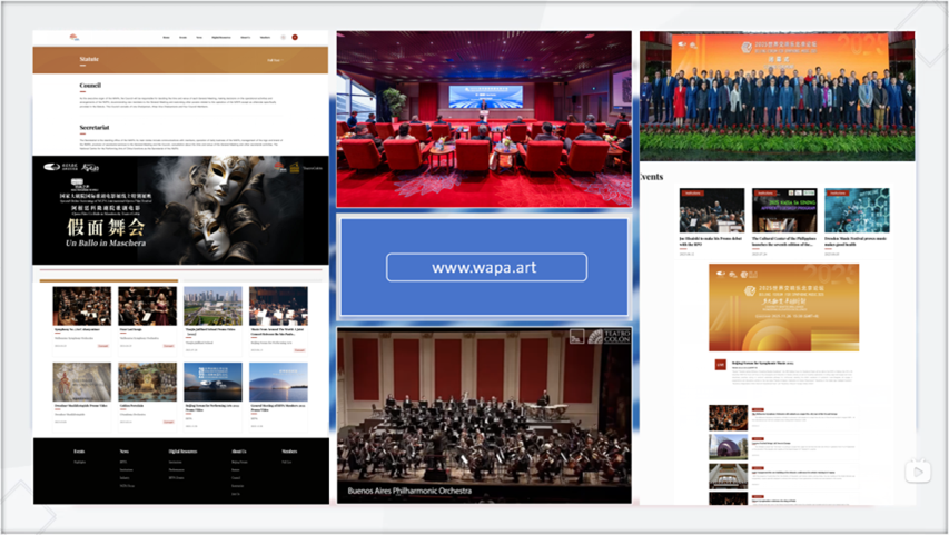 In 2025, the WAPA Secretariat continued to improve institutional development, further broadening channels and consolidating the foundation for the development and services of member institutions, as well as in-depth exchanges and cooperation among them. The 2025 WAPA Council Meeting made systematic arrangements for deepening the service system, optimizing cooperation mechanisms, and ensuring operational funds. WAPA's partner, Beijing Financial Street Capital Operation Group, made another donation to WAPA and reached a new phase of cooperation intention. Council members and representatives from institutions such as Teatro Real, Muscat Royal Opera House, Royal Ballet & Opera, and Teatro Colón jointly reviewed and approved the 2026 WAPA budget and offered suggestions for WAPA's next phase of work. WAPA official website (www.wapa.art) maintained regular updates, serving as a core window for information sharing and image display, with continuous improvement in organizational transparency and cohesion.